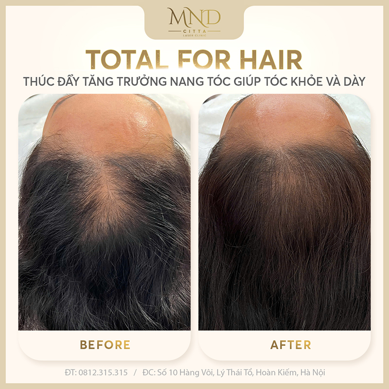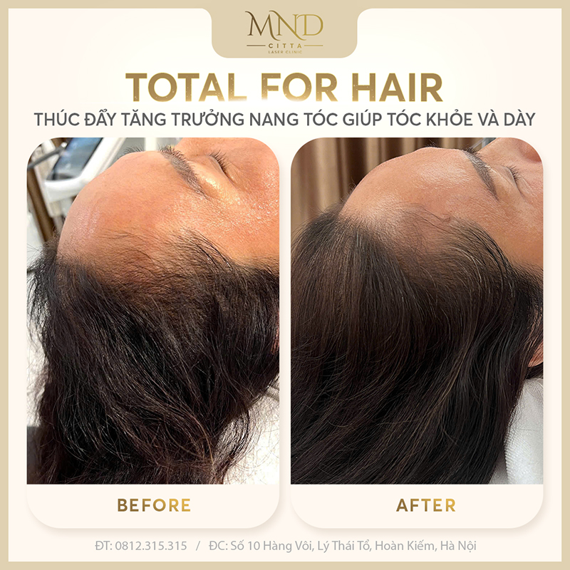 MND Total for Hair là liệu pháp tiên tiến kết hợp công nghệ Smooth Laser và 3S-RF, nhằm tái tạo và nuôi dưỡng nang tóc một cách hiệu quả. Sử dụng bước sóng đa tác động để loại bỏ tế bào sừng và giải phóng các bít tắc tại nang tóc. Kích thích tổn thương từ mầm tế bào tóc, khôi phục và kích thích mọc tóc tự nhiên, giúp tóc chắc khỏe hơn.